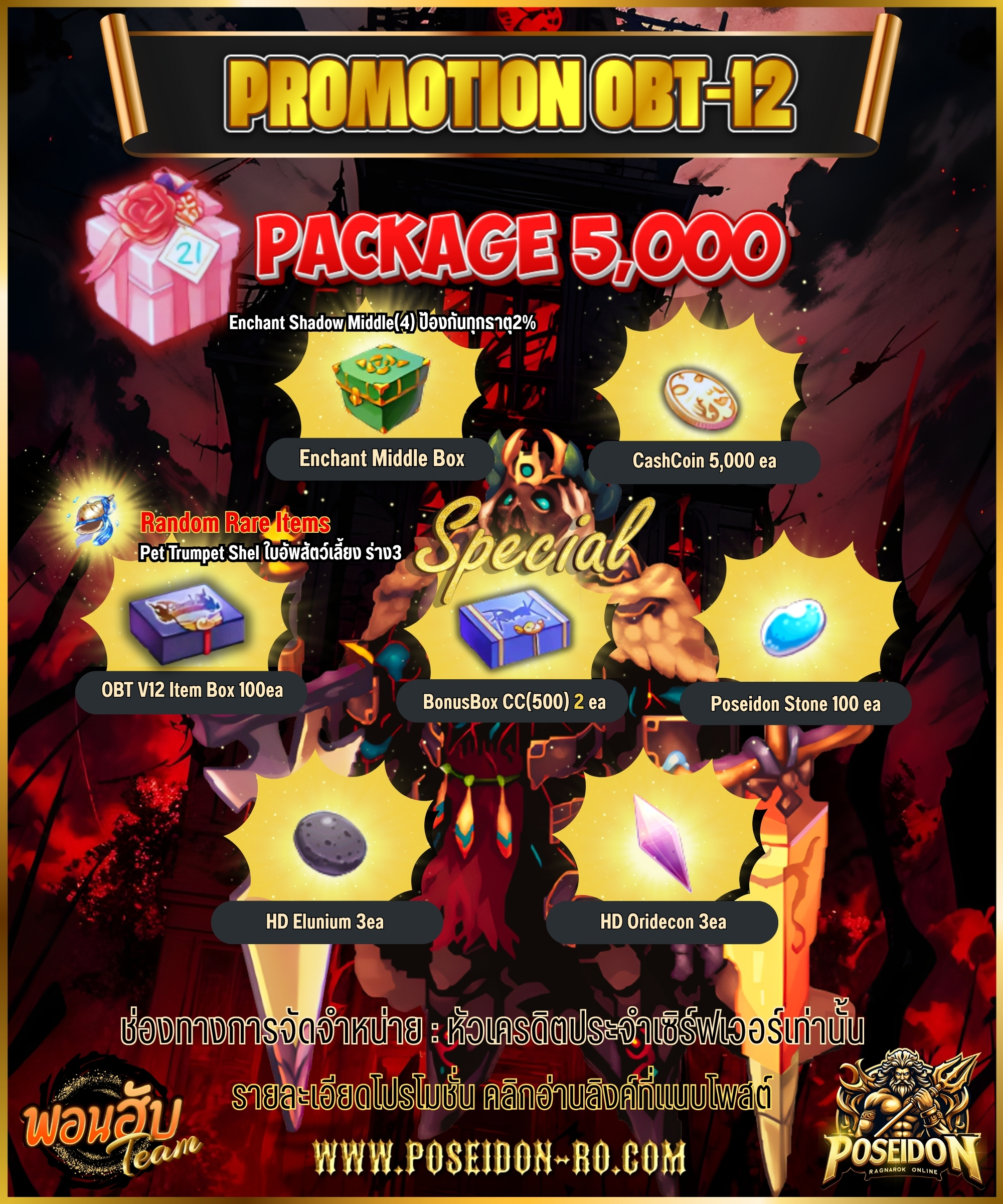 Promotion OBT 5K รายการไอเทมโปรโมชั่น Cashcoin 5,000 ea. Bonus Cash Box (500) 2 ea. OBT V12 Item Box 100 ea. Poseidon Stone 100 ea. HD Elunium 3 ea. ใช้งานได้ถึง +7 HD Oridecon 3 ea. ใช้งานได้ถึง +7 Enchant Shadow Middle (4) ป้องกันทุกธาตุ 2% (ใช้ใน GVG ได้) OBT V12 Item Box เปิดเพื่อลุ้นรับไอเทม 1 รายการ Mental Potion 3 ea. Status Str+5 Potion 1 ea. Status Agi+5 Potion 1 ea. Status Vit+5 Potion 1 ea. Status Int+5 Potion 1 ea. Status Dex+5 Potion 1 ea. Status Luk+5 Potion 1 ea. Dungeon Teleport Scroll 3 ea. Enriched Elunium 1 ea. Enriched Oridecon 1 ea. HD Elunium 1 ea. ใช้งานได้ถึง +7 HD Oridecon 1 ea. ใช้งานได้ถึง +7 Pet Trumpet Shel ขั้น 3 1 ea. วิธีใช้ Pet Trumpet Shel ขั้น 3 สำหรับอัพเกรดสัตว์เลี้ยง • สามารถใช้งานระบบได้ที่ NPC พิกัด Morocc 164, 190 • วัสถุดิบสำหรับอัพเกรดสัตว์เลี้ยงดังนี้ > Pet Trumpet Shel ขั้น 3 x1 > Elunium x50 > Oridecon x50 > 17,100,000 Zeny > โอกาสสำเร็จ 100%
