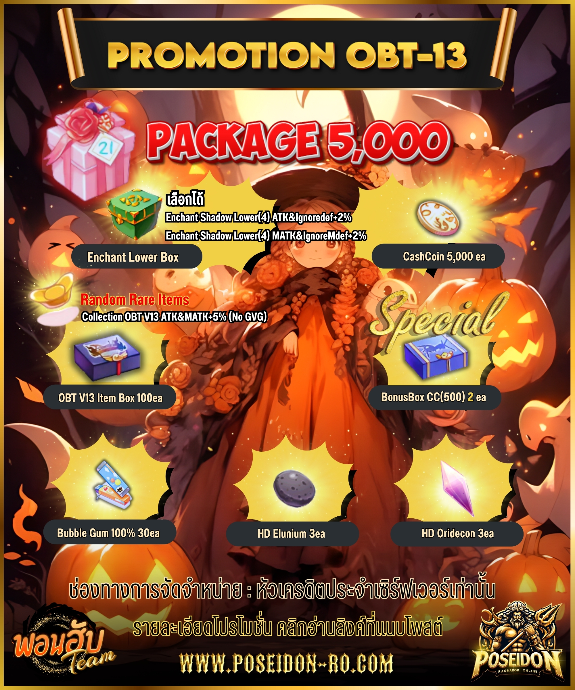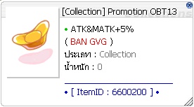 Promotion OBT 5K รายการไอเทมโปรโมชั่น Cashcoin 5,000 ea. Bonus Cash Box (500) 2 ea. OBT V13 Item Box 100 ea. Bubble Gum 100% 30 ea. HD Elunium 3 ea. ใช้งานได้ถึง +7 HD Oridecon 3 ea. ใช้งานได้ถึง +7 Enchant Lower Box เปิดเพื่อเลือกรับไอเทม 1 รายการ Enchant Shadow Lower (4) ATK&Ignoredef+2% (ใช้ใน GVG ได้) Enchant Shadow Lower (4) MATK&IgnoreMdef+2% (ใช้ใน GVG ได้) OBT V13 Item Box เปิดเพื่อลุ้นรับไอเทม 1 รายการ Mental Potion 3 ea. Status Str+5 Potion 1 ea. Status Agi+5 Potion 1 ea. Status Vit+5 Potion 1 ea. Status Int+5 Potion 1 ea. Status Dex+5 Potion 1 ea. Status Luk+5 Potion 1 ea. Dungeon Teleport Scroll 3 ea. Enriched Elunium 1 ea. Enriched Oridecon 1 ea. HD Elunium 1 ea. ใช้งานได้ถึง +7 HD Oridecon 1 ea. ใช้งานได้ถึง +7 [Collection] Promotion OBT13(No GVG) 1 ea.
