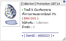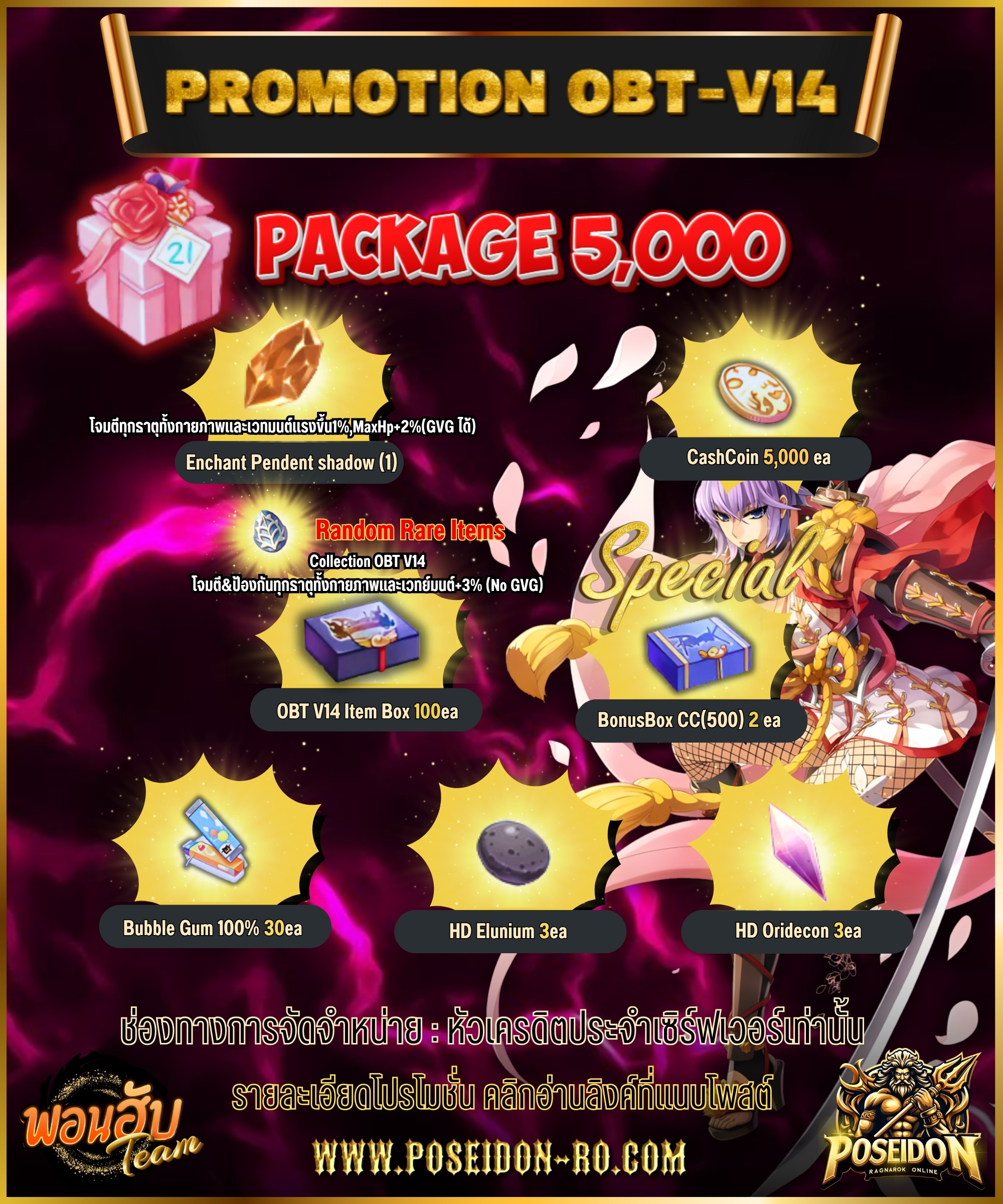 Promotion OBT 5K รายการไอเทมโปรโมชั่น Cashcoin 5,000 ea. Bonus Cash Box (500) 2 ea. OBT V14 Item Box 100 ea. Bubble Gum 100% 30 ea. HD Elunium 3 ea. ใช้งานได้ถึง +7 HD Oridecon 3 ea. ใช้งานได้ถึง +7 Enchant Pendent Shadow (ใช้ใน GVG ได้) OBT V14 Item Box เปิดเพื่อลุ้นรับไอเทม 1 รายการ Mental Potion 3 ea. Status Str+5 Potion 1 ea. Status Agi+5 Potion 1 ea. Status Vit+5 Potion 1 ea. Status Int+5 Potion 1 ea. Status Dex+5 Potion 1 ea. Status Luk+5 Potion 1 ea. Dungeon Teleport Scroll 3 ea. Enriched Elunium 1 ea. Enriched Oridecon 1 ea. HD Elunium 1 ea. ใช้งานได้ถึง +7 HD Oridecon 1 ea. ใช้งานได้ถึง +7 [Collection] Promotion OBT14 (No GVG) 1 ea.