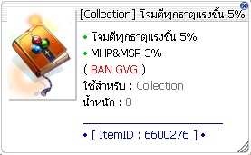 Promotion OBT 5K รายการไอเทมโปรโมชั่น Cashcoin 5,000 ea. Bonus Cash Box (500) 2 ea. OBT V17 Item Box 100 ea. Bubble Gum 100% 20 ea. Bubble Gum EQ 100% 20 ea. Poseidon Stone 30 ea. HD Elunium 3 ea. ใช้งานได้ถึง +7 HD Oridecon 3 ea. ใช้งานได้ถึง +7 Enchant Earring Shadow (3) โจมตีทุกขนาด 2% (ใช้ใน GVG ได้) OBT V17 Item Box เปิดเพื่อลุ้นรับไอเทม 1 รายการ Mental Potion 3 ea. Status Str+5 Potion 1 ea. Status Agi+5 Potion 1 ea. Status Vit+5 Potion 1 ea. Status Int+5 Potion 1 ea. Status Dex+5 Potion 1 ea. Status Luk+5 Potion 1 ea. Dungeon Teleport Scroll 3 ea. Enriched Elunium 1 ea. Enriched Oridecon 1 ea. HD Elunium 1 ea. ใช้งานได้ถึง +7 HD Oridecon 1 ea. ใช้งานได้ถึง +7 [Collection] โจมตีทุกธาตุแรงขึ้น 5% ea.