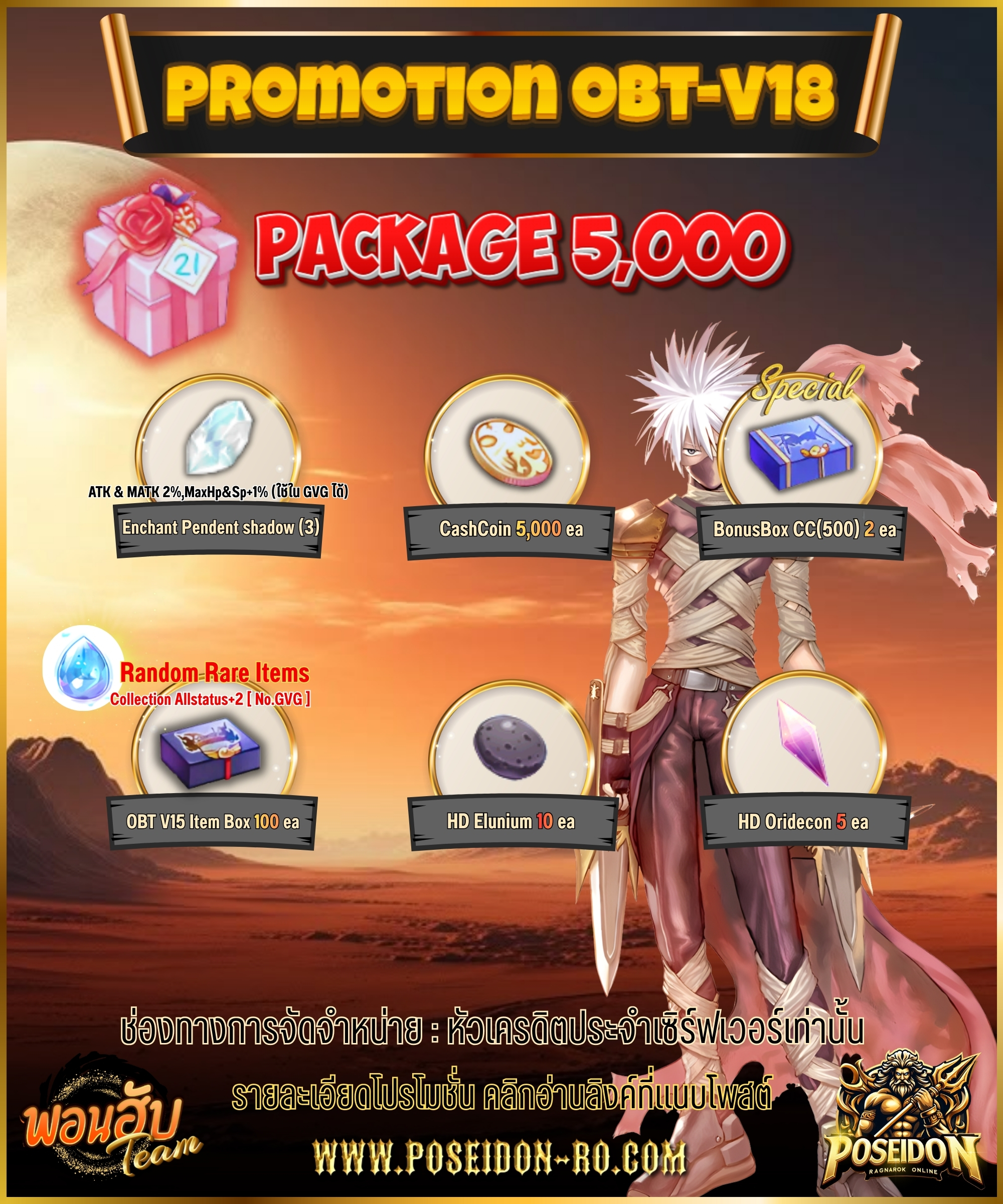 Promotion OBT 5K รายการไอเทมโปรโมชั่น Cashcoin 5,000 ea. Bonus Cash Box (500) 2 ea. OBT V18 Item Box 100 ea. HD Elunium 10 ea. ใช้งานได้ถึง +7 HD Oridecon 5 ea. ใช้งานได้ถึง +7 Enchant Pendent Shadow (3) ATK&MATK 2% (ใช้ใน GVG ได้) OBT V18 Item Box เปิดเพื่อลุ้นรับไอเทม 1 รายการ Mental Potion 3 ea. Status Str+5 Potion 1 ea. Status Agi+5 Potion 1 ea. Status Vit+5 Potion 1 ea. Status Int+5 Potion 1 ea. Status Dex+5 Potion 1 ea. Status Luk+5 Potion 1 ea. Dungeon Teleport Scroll 3 ea. Enriched Elunium 1 ea. Enriched Oridecon 1 ea. HD Elunium 2 ea. ใช้งานได้ถึง +7 HD Oridecon 2 ea. ใช้งานได้ถึง +7 [Collection] Allstatus +2 (V2) 1 ea.