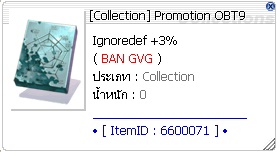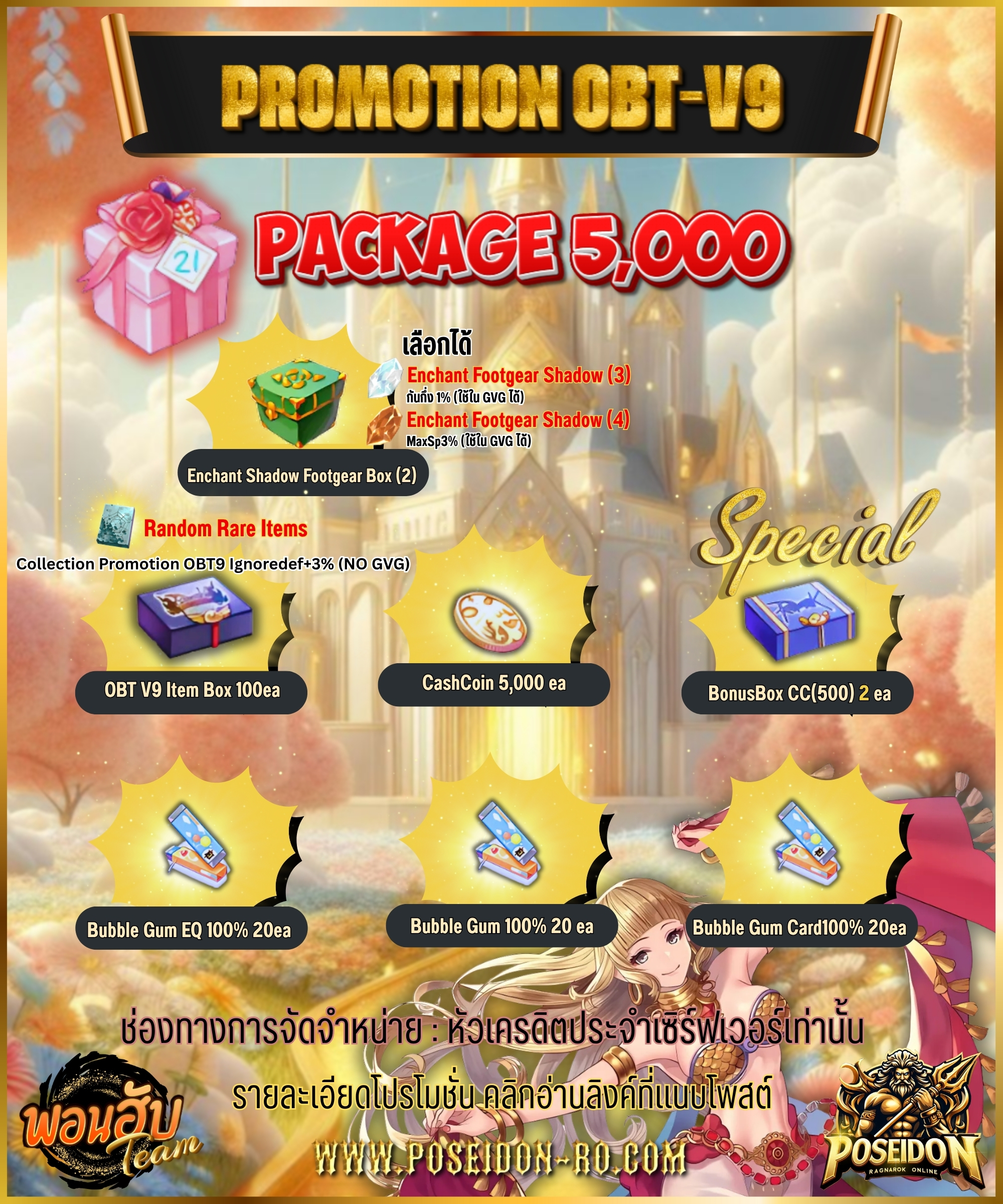 Promotion OBT 5K รายการไอเทมโปรโมชั่น Cashcoin 5,000 ea. Bonus Cash Box (500) 2 ea. OBT V9 Item Box 100 ea. Bubble Gum 100% 20 ea. Bubble Gum EQ 100% 20 ea. Bubble Gum Card 100% 20 ea. Enchant Shadow Footgear Box 1 ea. Enchant Shadow Footgear Box เปิดเพื่อเลือกรับไอเทม 1 รายการ Enchant Shadow Footgear (3) ป้องกันกึ่งมนุษย์ 1% (ใช้ใน GVG ได้) Enchant Shadow Footgear (4) MAXSP 3% (ใช้ใน GVG ได้) OBT V9 Item Box เปิดเพื่อลุ้นรับไอเทม 1 รายการ Mental Potion 1 ea. Status Str+5 Potion 1 ea. Status Agi+5 Potion 1 ea. Status Vit+5 Potion 1 ea. Status Int+5 Potion 1 ea. Status Dex+5 Potion 1 ea. Status Luk+5 Potion 1 ea. Dungeon Teleport Scroll 1 ea. Recruit Siege Supply Box 1 ea. ASPD Intensivfying Potion 1 ea. [Collection] Promotion OBT9 1 ea.